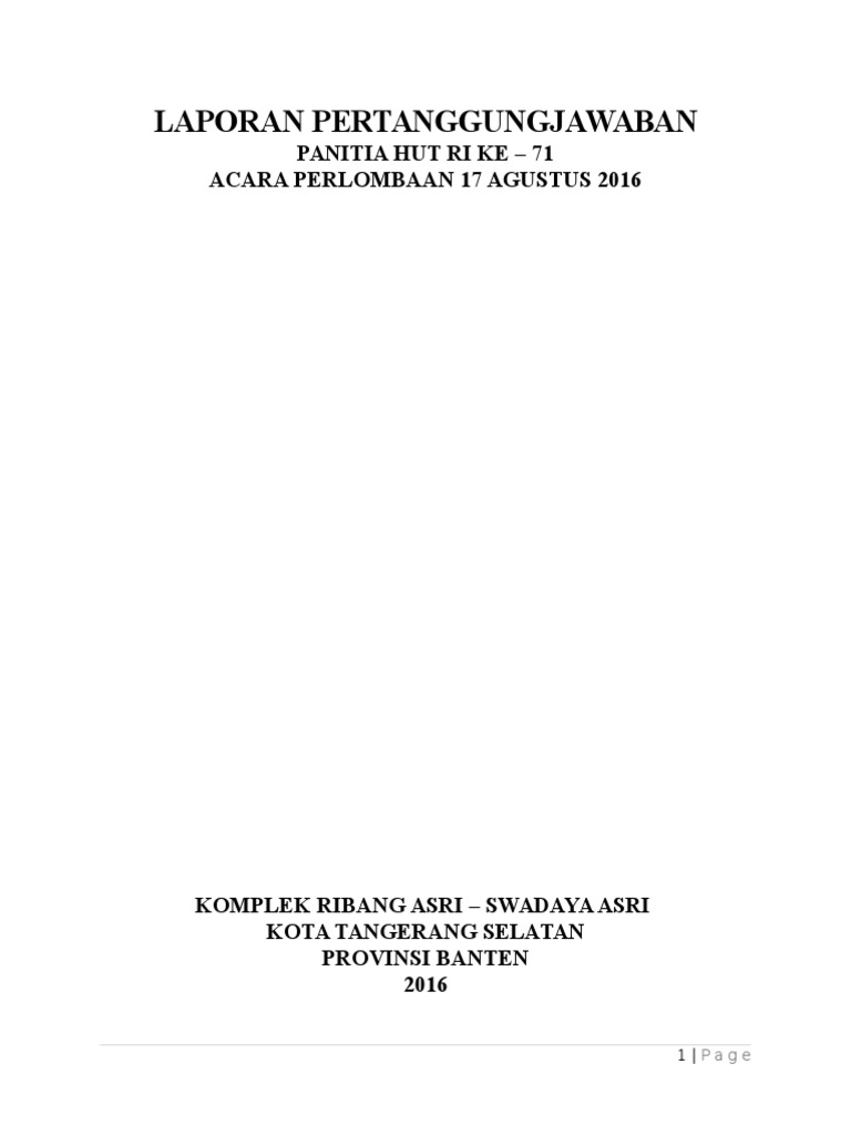 Laporan pertanggungjawaban kegiatan lomba 17 agustus 2018. Peristiwa proklamasi kemerdekaan ri pada tanggal 17 agustus 1945 telah mengantarkan bangsa indonesia memasuki pintu gerbang kemerdekaan perjuangan para pahlawan telah dilakukan dengan gigih dan banyak terjadi pertumpahan darah. Tema hut ri ke 6 7. Sumbangan masyarakat rp 604000 2. Nama kegiatan ini bernama. Laporan pertanggungjawaban peringatan hari kemerdekaan indonesia 17 agustus 2015 karang taruna sido muncul desa sendangmulyo kecamatan bulu kabupaten rembang tahun 2015 lembar pengesahan laporan pertanggungjawaban jenis kegiatan.