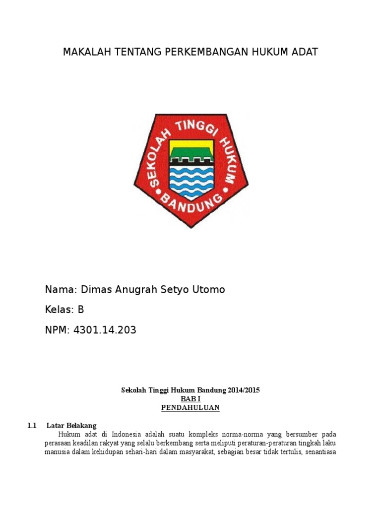 Contoh makalah hukum adat. Hal ini karena pepatah adat biasanya syarat akan makna filosofis. Saya dapat pastikan juga bahawa materi hukum adat yang disajikan dalam artikel. Dalam banyak meskipun tidak semua contoh hukum adat akan memiliki putusan pengadilan mendukung dan hukum kasus yang telah berkembang dari waktu ke waktu untuk memberikan bobot tambahan untuk aturan mereka sebagai hukum dan juga untuk menunjukkan lintasan evolusi jika ada dalam penafsiran hukum tersebut seperti tujuan konstitusi. Sumber hukum adat adalah peraturan peraturan yang tidak tertulis yang tumbuh dan berkembang dalam masyarakat dan dipertahankan. Puji syukur kepada allah swt atas karunia hidayah dan nikmatnya penulis dapat menyelesaikan makalah ini. Makalah hukum adat dunia ilmu.