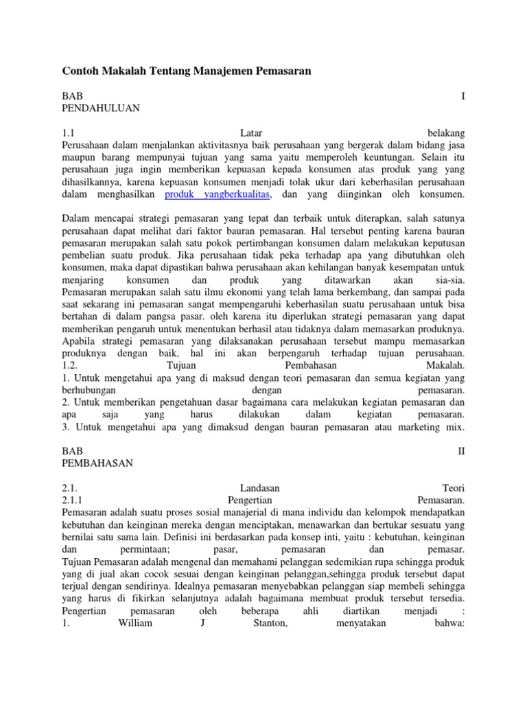 Contoh makalah manajemen pemasaran. Strategi pemasaran makalah contoh renacana tujuan konsep dosenpendidikancom untuk pembahasan kali ini kami akan mengulas mengenai strategi pemasaran yang dimana dalam hal ini meliputi tujuan fungsi faktor dan macam nah agar lebih dapat memahami dan dimengerti simak ulasan selengkapnya dibawah ini. Academiaedu is a platform for academics to share research papers. Makalahid apakah di sini ada yang pernah mengerjakan skripsi. Makalah ini terdapat. Makalah strategi pemasaran makalah strategi pemasaran adalah penjelasan singkat tentang strategi pemasaran suatu produk dalam sebuah perusahaan. Strategi pemasaran membutuhkan analisis dan ketelitian dalam melihat pasar dan menentukan aksi dalam melakukan produksi sebuah produk.