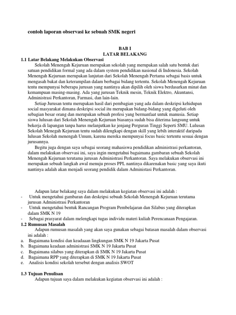 Contoh makalah observasi sekolah. Home administrasi perkantoran ilmu pendidikan makalah contoh laporan observasi ke sebuah smk negeri. Sekolah menengah kejuruan merupakan sekolah yang merupakan salah satu bentuk dari satuan pendidikan formal yang ada dalam system pendidikan nasional di indonesia. Contoh laporan observasi manajemen keuangan sekolah. Makalahid seperti apa contoh laporan hasil obsevasi sekolah. Andhika puspita siwi 13420171 2. Sindanggalih kelurahan kahuripan kecamatan tawang kota tasikmalaya.