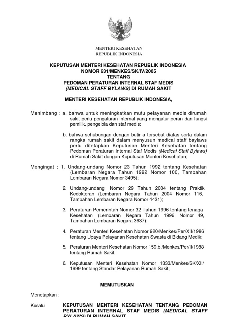 Kmk No 631 Ttg Pedoman Peraturan Internal Staf Medis