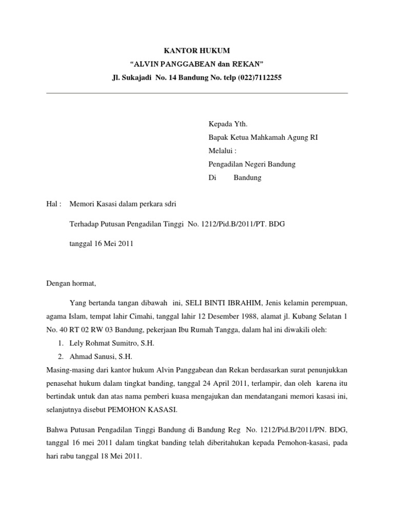 Contoh memori kasasi perdata. Dengan ini menyampaikan kontra memori kasasi atas memori kasasi yang diajukan pemohon kasasi terhadap putusan pengadilan tinggi padang nomor. Bandung 2 februari 2013. Undang undang republik indonesia nomor 38 tahun 1999 tentang pengelolaan zakat. Sejarah kelahiran madzhab sejarah. Karena merasa penasaran maka saya selaku ahli waris mencoba menanyakan ke pengadilan dan. Sendi nugraha 110110090144 fh unpad memori kasasi.