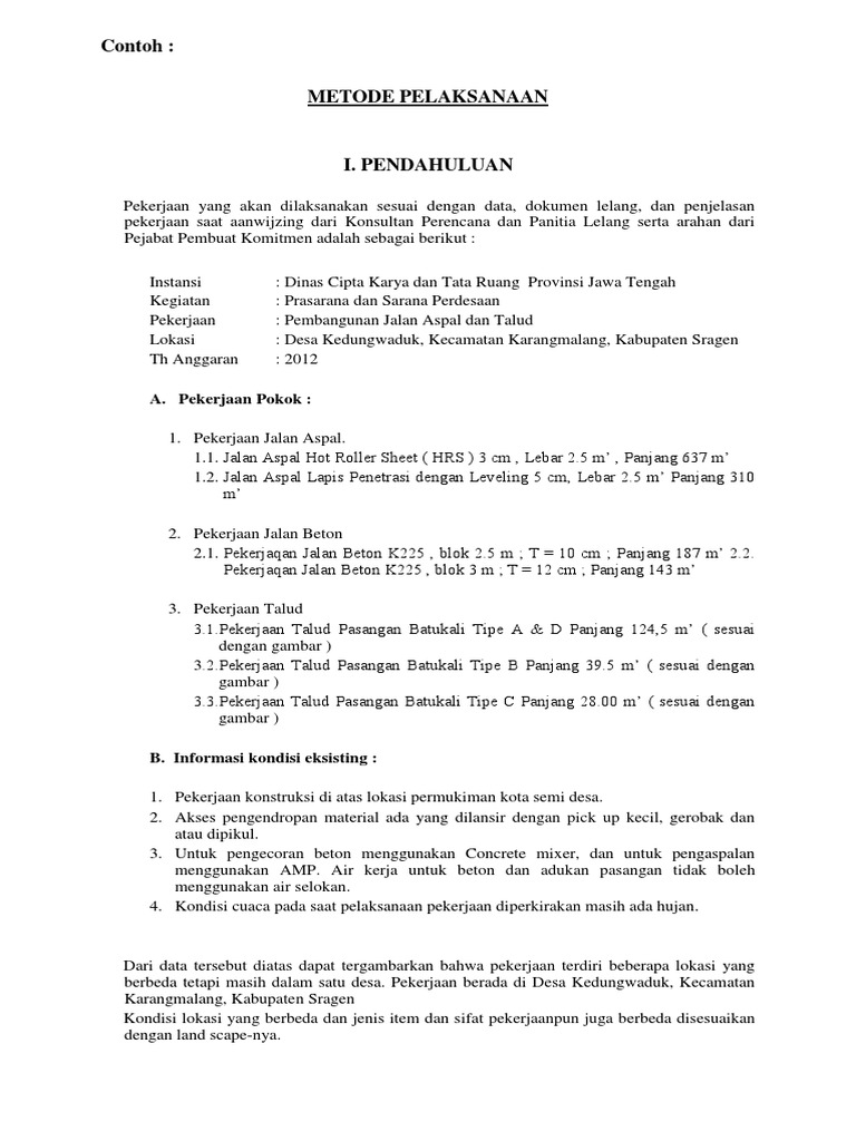 Untuk paket pekerjaan ini pemerintah menganggarkan dana dengan nilai hps sebesar rp 7165800000 tujuh milyar ser atus e nam puluh lima juta delapan ratus ribu rupiah dengan target panjang pekerjaan sepanjang 2700 m 27 km dengan jangka waktu pelaksanaan selama 1 8 0 seratus delapan puluh hari kalender dan jangka waktu pemeliharaan selama 360 tiga ratus enam puluh hari kalender. Metode pelaksanaan pekerjaan mobilisasi 1. Bagi anda yang sedang mencari contoh metode pelaksanaan untuk item pekerjaan mobilisasi disini saya akan memberikan contoh metode tersebut kebetulan saya juga bekerja di sebuah perusahaan yang bergerak dibidang pekerjaan jalan yang juga bertugas sebagai pembuat penawaran proyek. Metode pelaksanaan pekerjaan jalan sesuai spesifikasi teknis.