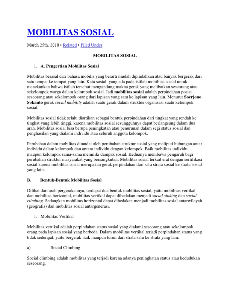 Mobilitas sosial menggambarkan gerakan perubahan. Adalah perubahan susunan status orang orang dalam masyarakat baik secara vertikal maupun secara horizontal. Selain itu mobilitas vertikal dapat dibedakan menjadi mobilitas vertikal intragenerasi dan mobilitas vertikal antargenerasi. Seorang anak yang tidak naik kelas dan mengulang pada kelas yang sama contoh mobilitas sosial horizontal dalam pendidikan. Mendapatkan promosi jabatan dari pekerja menjadi manajer jawaban panjang. Salam sahabat pendidikan sekalian berikut adalah artikel singkat yang akan membahas mengenai pengertian dan bentuk betuk mobilitas sosial yang diharapkan mampu menjadi jawaban atau referensi untuk anda dalam proses belajar dimanapun berada betikut ulasannya.