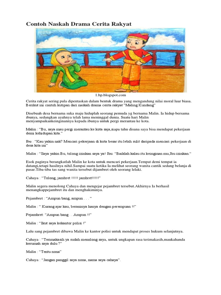 Contoh naskah drama cerita rakyat. Kini tayangan pertunjukan drama sudah berkembang menjadi semakin modern dan beragam tidak seperti pada masa lalu. Memang perlu ada usaha. Tapi jangan khawatir. Contoh naskah drama cerita rakyat yang ingin ditampilkan kedalam sebuah pertunjukan harus dibuat sedemikian menarik dan detail sehingga tidak membingungkan saat akan di pertunjukan. Berikut ini contoh kutipan dari naskah drama cerita rakyat maling kundang disebuah desa bernama suka maju hiduplah seorang pemuda yg bernama malin. Contoh naskah drama singkat.