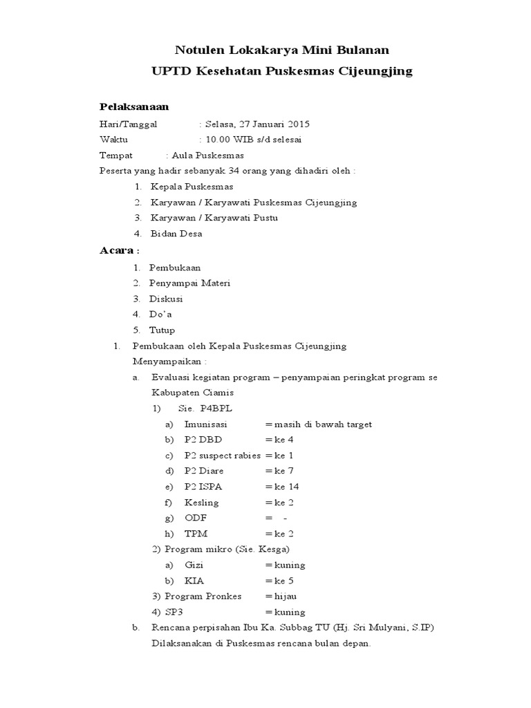 Dari proses lokakarya mini baik bulanan maupun tribulanan diharapkan dapat dilakukan pemantauan dan pengendalian pelaksanaan kegiatan puskesmas berdasarkan rencana pelaksanaan kegiatan rpk puskesmas identifikasi permasalahan yang dihadapi selanjutnya dilakukan rumusan pemecahannya sehingga dapat dilakukan perbaikan rencana kegiatan untuk periode berikutnya secara berkesinambungan. Notulen lokmin puskesmas tiap bulan by yulia 462969 in types school work notulen lokmin puskesmas bulanan. Puskesmas mojoagung pada tanggal 17 juli 2008 mengadakan acara lokakarya mini acara yang rutin yang diadakan tiap 3 bulanan ini dihadiri oleh seluruh staf. Masukan l 2 3 4. Doc notulen lokmin puskesmas tanggulangin academiaedu. Lokakarya mini atau lokmin bulanan puskesmas bukanlah hal baru bagi petugas puskesmas karena kegiatan ini wajib dilaksanakan karena merupakan bagian dari manajemen puskesmas itu sendiri.