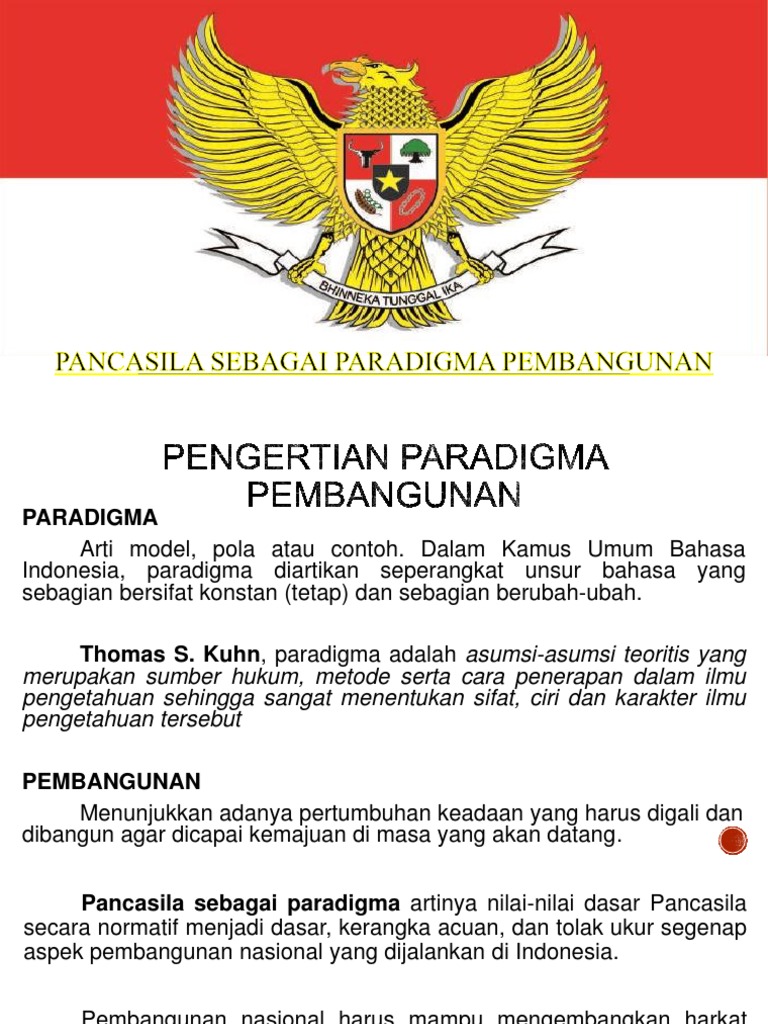 Pancasila ini menjadi paradigma bagi bangsa indonesia artinya adalah bahwa pancasila ini menjadi pilihan bangsa indonesia yang memberikan arah atau juga pola kehidupan berbangsa serta bernegara di dalam segala bidang kehidupan mulai dari bagian paling dasar yakni ideology sampai kepada bidang teknis yakni pembangunan. Pengertian pancasila sebagai paradigma pembangunan dan fungsi adalah untuk mewujudkan apa yang dicita citakan seseorang pasti akan melakukan hal yang paling mendasar untuk mewujudkan cita citanya. Pancasila sebagai paradigma pembangunan artinya pancasila berisi anggapan anggapan dasar yang merupakan kerangka keyakinan yang berfungsi sebagai acuan pedoman dalam perencanaan pelaksanaan pengawasan dan pemanfaatan hasil hasil pembangunan nasional. Hal ini sebagai konsekuensi atas pengakuan dan penerimaan bangsa indonesia atas pancasila sebagai dasar negara dan ideologi nasional.