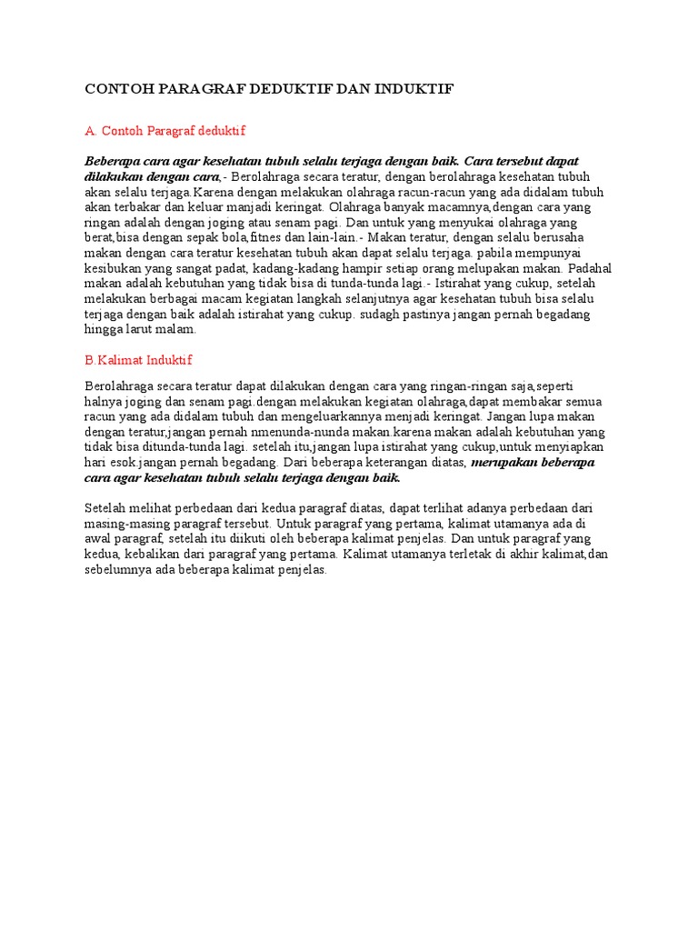 Contoh paragraf deduktif induktif. Silahkan kalian simak penjelasan lengkapnya sebagai berikut. Dalam sebuah paragraf umumnya memiliki susunan yang diawali dengan kalimat utama kemudian disusul dengan kalimat pendukung atau penjelas. Paragraf deduktif induktif dan campuran lengkap dengan bahasan mengenai pengertian ciri khusus paragraf beserta contoh dan pola pengembangannya. Tidak hanya contohnya saja yang akan kita sajikan melainkan juga pengertian ciri ciri dan jenis dari 3 paragraf ini. Paragraf deduktif adalah sebuah paragraf yang kalimat utamanya berada pada awal atau baris pertama paragraf. Pada paragraf induktif ada beberapa jenis yakni generalisasi analogi sebab akibat dan perbandingan.