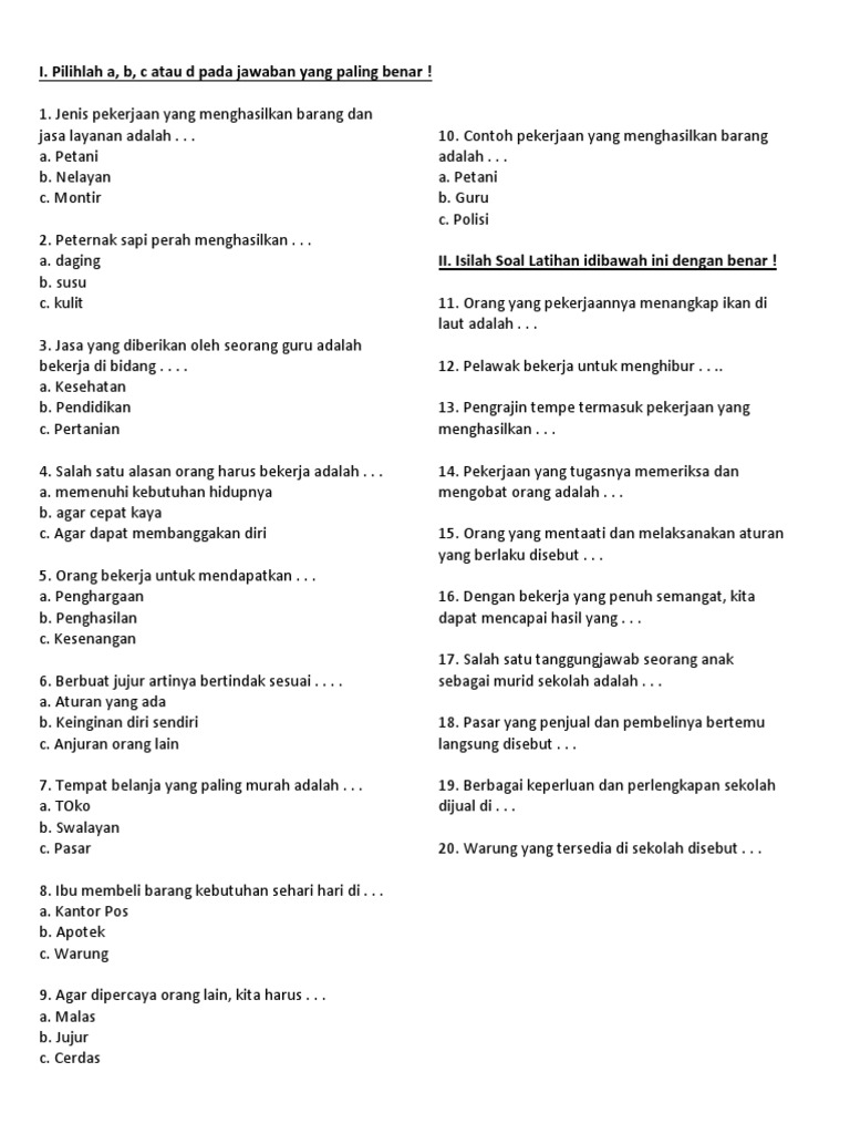 Jenis pekerjaan yang menghasilkan barang dalam kehidupan sehari hari manusia dituntut untuk dapat memenuhi kebutuhan hidupnya. Pekerjaan yang menghasilkan jasa adalah suatu pekerjaan yang di mana dari hasil pekerjaanya bisa di nikmati dan di rasakan oleh orang lain dan pada pekerjaan yang menghasilkan jasa ini tidak menghasilkan barangcontoh dari pekerjaan yang menghasilkan jasa ini seperti gurudoktertukang potong rambutpolisi dan masih banyak lagi. Pekerjaan yang menghasilkan barang adalah suatu kegiatan yang dikerjakan dengan tujuan untuk menghasilkan suatu barang atau produk nyata. Di zaman yang sekarang ini maka segala jenis perubahan. Jenis pekerjaan ini menghasilkan jasa yang dibutuhkan oleh masyarakat lainnya. Contoh barang setengah jadi.