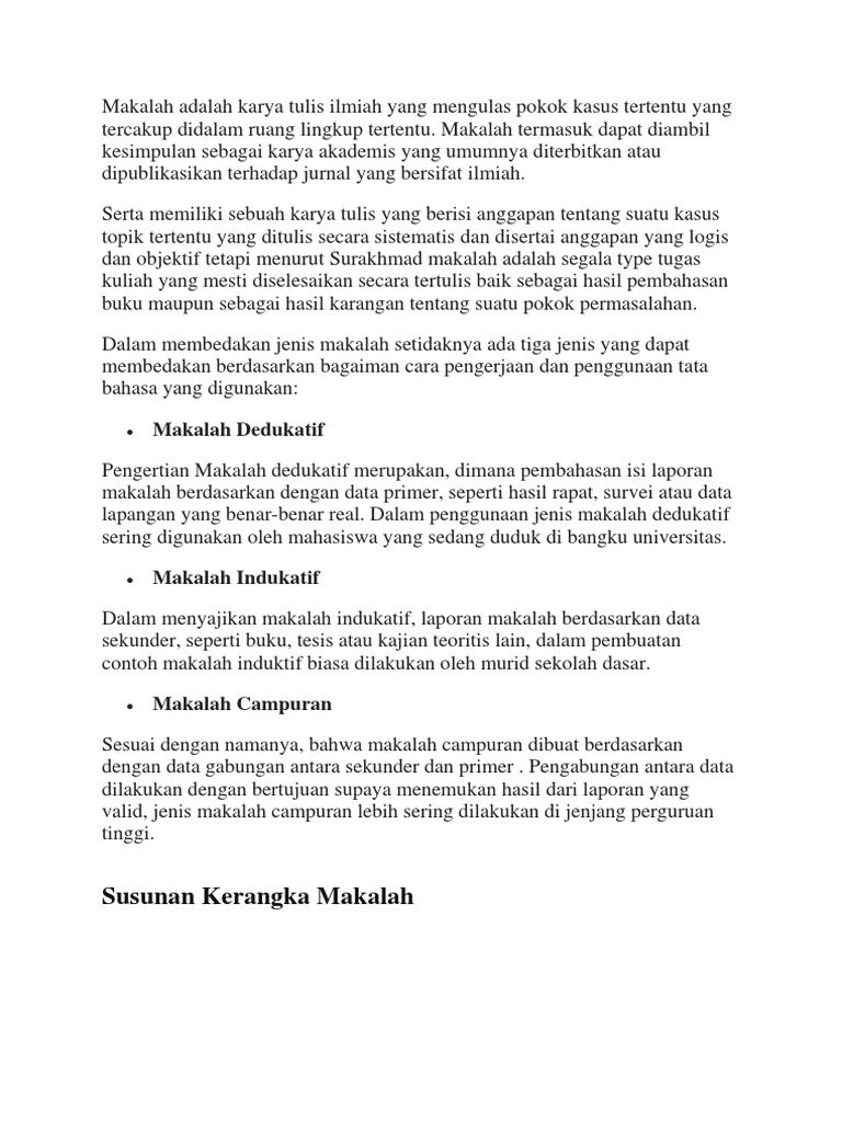 Contoh makalah saat di perkuliahan dalam menulis makalah akan dituntut benar dan mungkin bisa dibilang sempurna. Jika pada makalah laporan maka di bagian pembahasan dibahas mengenai kegiatan apa saja yang dilakukan tujuan dan fungsi diadakannya kegiatan tersebut hingga durasi dan hal hal lain yang patut untuk dilaporkan setelah melakukan kegiatan. Dalam pembahasan makalah inilah semua materi tinjuan pustaka hasil penelitian berupa wawancara observasi lapangan kegiatan eksperimen laboratorium dan lain lain ditulis secara detail untuk menjawab point point penting yang dirumuskan dalam rumusan masalah pada bab i makalah. Satu persatu permasalahan dijabarkan menggunakan data yang diperoleh dengan jelas. Penjelasan mengenai hasil penelitian tersebut bisa disampaikan sesuai dengan poin poin rumusan masalah yang biasanya disampaikan pada bab i. Wjs poerwadarminta pada tahun 1994 mengartikan makalah sebagai uraian tertulis yang membahas suatu masalah tertentu yang dikemukakan untuk mendapat pembahasan lebih lanjuttanjung dan ardial juga mengartikan makalah adalah karya tulis yang memuat pemikiran tentang suatu masalah atau topik tertentu yang ditulis secara sistematis dan disertai analisis yang logis dan objektif.