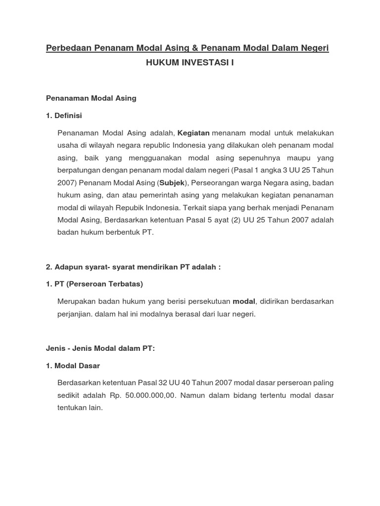 Contoh pma di indonesia uu tentang penanaman modal asing yang diberlakukan tahun 2007 silam semakin menyiratkan bahwa pemerintah tidak berdaya menolak intervensi dan kepentingan asing. Dalam hal terdapat unsur asing baik sebagian ataupun seluruhnya maka pt tersebut harus berbentu pt. Suatu pt biasa yang dalam perkembangannya memasukkan pemodal baru yang berstatus asing baik itu perorangan maupun badan hukum maka pt. Contoh bidang usaha yang tertutup bagi penanaman modal aasing adalah pelabuhan listrik umum telekomunikasi pelayaran penerbangan air minum kereta api umum pembangkit tenaga atom mass media dan bidang bidang usaha yang berkaitan dengan industri militer. Posting pada ekonomi ditag 10 contoh pmdn 10 perusahaan asing di indonesia batas maksimum kepemilikan modal asing bentuk penanaman modal asing bkpm regulation 6 2018 caltex merupakan contoh penanaman modal asing dari cara mendapatkan penanaman modal asing cara mengatasi investor asing contoh akta pendirian pt pma contoh globalisasi di bidang agama brainly contoh kasus pmdn contoh. Penanaman modal dalam negeri selanjutnya disebut sebagai pmdn berdasarkan pasal 1 undang undang nomor 25 tahun 2007 tentang penanaman modal uupm kegiatan investasi untuk melakukan usaha di wilayah negara republik indonesia yang dibuat oleh investor dalam negeri dengan menggunakan modal dalam negeri.