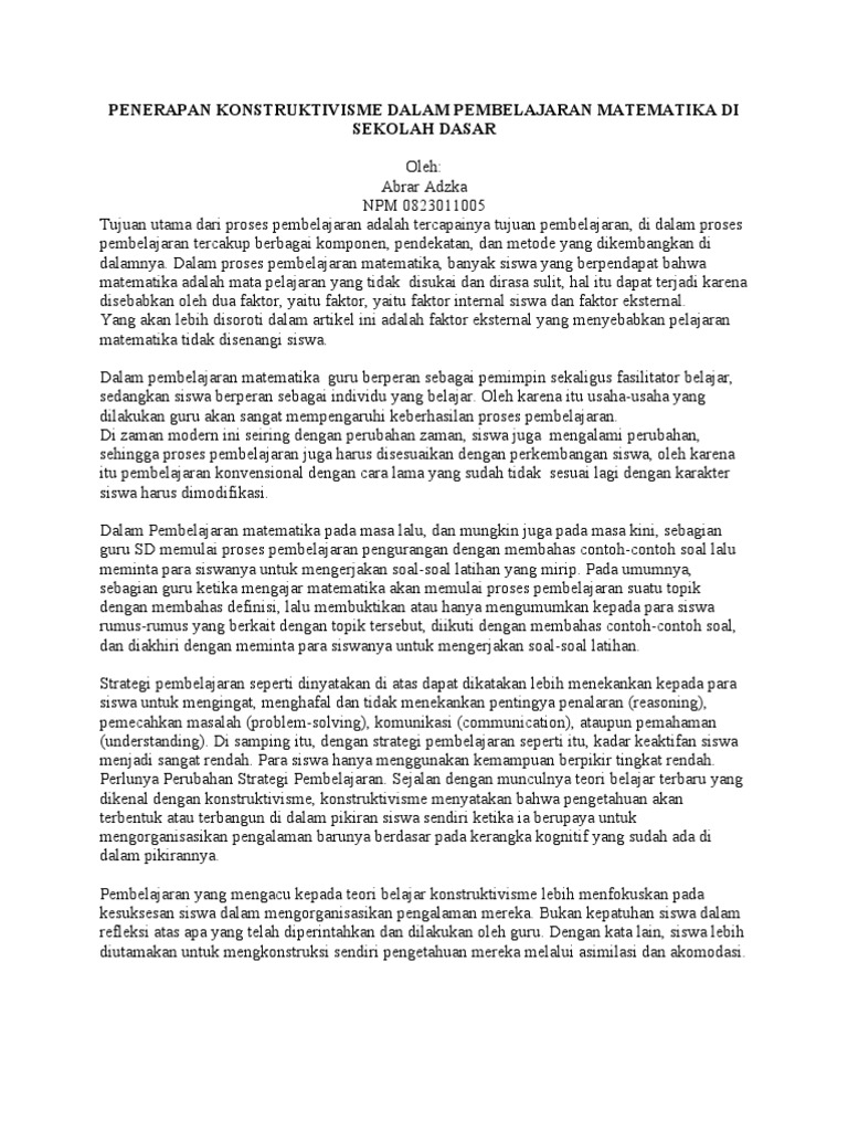 1 memberi kesempatan kepada siswa untuk mengemukakan gagasannya dengan bahasa sendiri 2 memberi kesempatan kepada siswa untuk berfikir tentang pengalamannya sehingga menjadi lebih kreatif dan imajinatif 3 memberi. Supaya lebih memudahkan anda dalam memahami apa itu teori belajar konstruktivisme kami akan memberikan beberapa contoh penerapan teori konstruktivisme dalam pembelajaran teori konstruktivisme dalam bentuk pdf dan makalah teori konstruktivisme. Anak anak kenapa kita harus mengkonsumsi sayur sayuran dengan pertanyaan seperti ini siswa pasti menanggapi atau merespon secara aktif dengan berbagai jawaban agar sehat supaya tidak buta. Teori belajar adalah upaya untuk menggambarkan bagaimana seseorang dapat belajar sehingga membantu kita memahami proses kompleks inheren pembelajaran. Contoh penerapan teori ini dalam pembelajaran misalnya dalam pembelajaran ipa sd guru memberikan rangsangan dengan memberi pertanyaan yang terbuka contoh. File yang akan kami berikan berformat pdf sehingga dapat anda baca sendiri di pc atau bahkan smartphone.