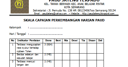 Skala perkembangan harian biasa atau disebut rating scale adalah checklist yang diturunkan dari rencana pelaksanaan pembelajaran harian rpph yang memuat indikator pencapaian perkembangan anak yang sudah ditetapkan sebelumnya. Apabila ada kekurangan saya. Contoh format ceklis skala capaian perkembangan anak usia dini paud. Catatan niniing suratiniingsih pendidikan anak usia dini tk. Contoh penilaian harian paud pendidikan anak usia dini. Beragam teknik evaluasi dan penilaian paud dapat dilakukan guna mengumpulkan informasi tentang perkembangan dan pertumbuhan anak usia dini di sekolah paud.