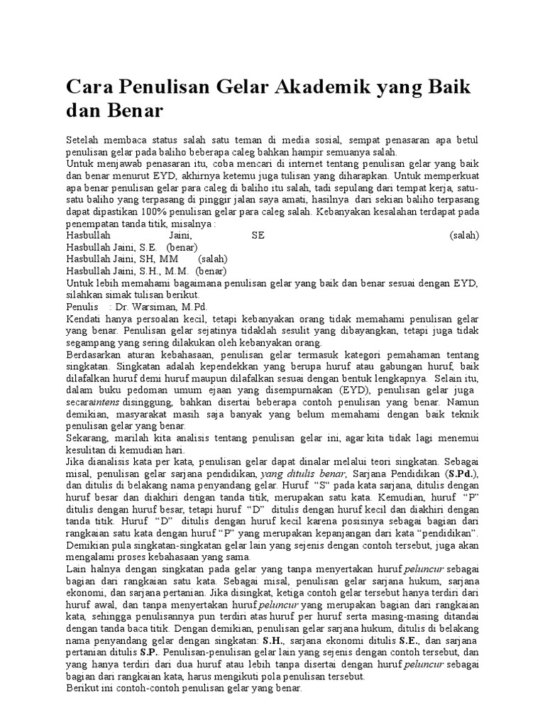 Contoh penulisan gelar yang benar. Bukan hanya itu jika menilik ke dalam ejaan yang disempurnakan. Pada intinya penulisan gelar yang benar berfokus pada penempatan tanda titik dan koma. Penulisan yang benar adalah setelah nama penyandang gelar dibubuhkan tanda koma kemudian diikuti gelar yang pertama ditulis dengan teknik penulisan yang benar lalu dibubuhkan tanda koma untuk penulisan gelar yang kedua dan seterusnya jika ada gelar gelar yang lain. Penulisan gelar doktor di indonesia sama halnya dengan penulisan gelar gelar yang lainnya. Penulisan gelar masih satu kelompok dengan pemahaman dalam penulisan singkatan. Singkatan sendiri adalah kependekan yang berbentuk huruf atau beberapa huruf yang dilafalkan huruf untuk huruf atau juga dilafalkan sesuai bentuk komplitnya.