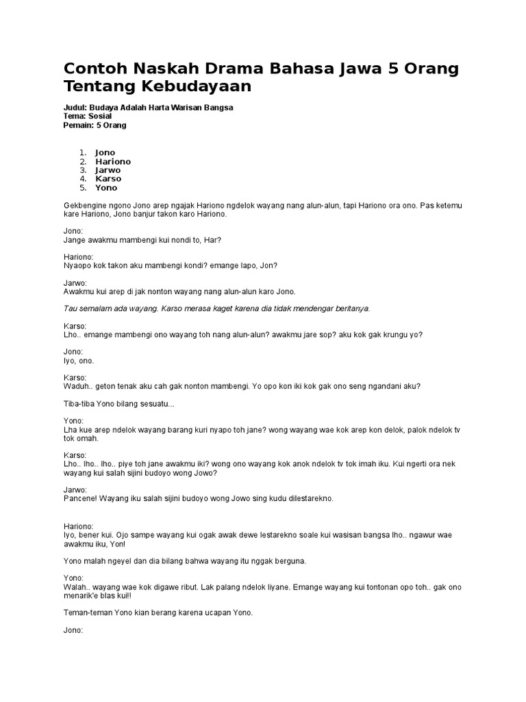 Kumpulan contoh percakapan bahasa indonesia singkat berikut ini mungkin bisa jadi referensi untuk kalian yang mendapat tugas untuk membuat percakapan bahasa indonesia antara dua orang. Dialog tentang kejujuran 3 orang drama 2 orang antagonis dan protagonis drama 2 orang bahasa jawa drama 2 orang tentang perpisahan drama pendek tentang persahabatan 2 orang. 85 percakapan bahasa indonesia singkat 2 orang. Naskah drama sunda lucu 2 orang percakapan 2 orang sahabat singkat. Pada umumnya untuk percakapan terdiri dari percakapan antara 2 3 dan 4 orang bahkan sampai 6 dan lainnya. Contoh naskah drama 2 orang mengejar cita cita judul.