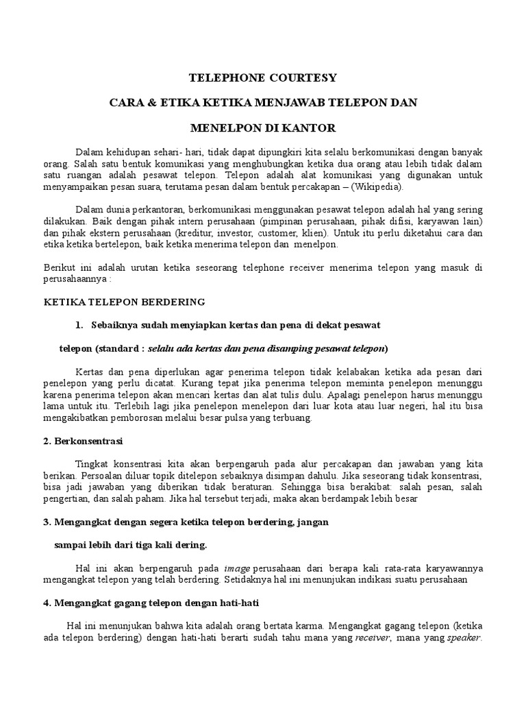 Contoh percakapan menerima telepon dalam perusahaan. Menerima reservasi lewat telepon. Penjelasan tentang etika berkomunikasi secara formal melalui telepon etika berkomunikasi salah satu nya melalui telepon adalah penting apabila anda adalah karyawan perusahaan staf. Hal tersebut dikarenakan lebih efektif dibandingkan harus pergi ketempat orangnya langsung. Cara menjawab telepon di kantor dalam bahasa inggris a. Namun apakah kita sudah memahami benar tatakrama bertelepon. Pertanyaan dan jawaban yang sering diajukan di kontes kecantikan.