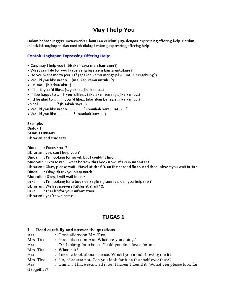 Contoh percakapan offering help. Kita bisa bermain berperan role playing dengan contoh dialog 2 orang dengan topik percakapan tertentu misalnya contoh dialog expressing preferences atau kesukaan. Setelah membaca percakapan diatas pastinya kalian lebih paham kan dengan penggunaan ungkapan asking for and giving help. Alright guys itu dia 3 contoh percakapan tentang asking for and giving help. 50 contoh kalimat passive voice 350 kata kerja bahasa inggris announcement di bandara asking and giving information asking and giving opinion contoh contoh adjective contoh article a an the contoh decriptive text contoh dialog agreement disagreement contoh dialog asking and giving opinion contoh greeting card contoh invitation birthday party contoh kalimat passive voice contoh kalimat past. Thanks but i prefer not to bother you. Materi bahasa inggris sma tentang offering help or things dan contoh halo sobat ibi.