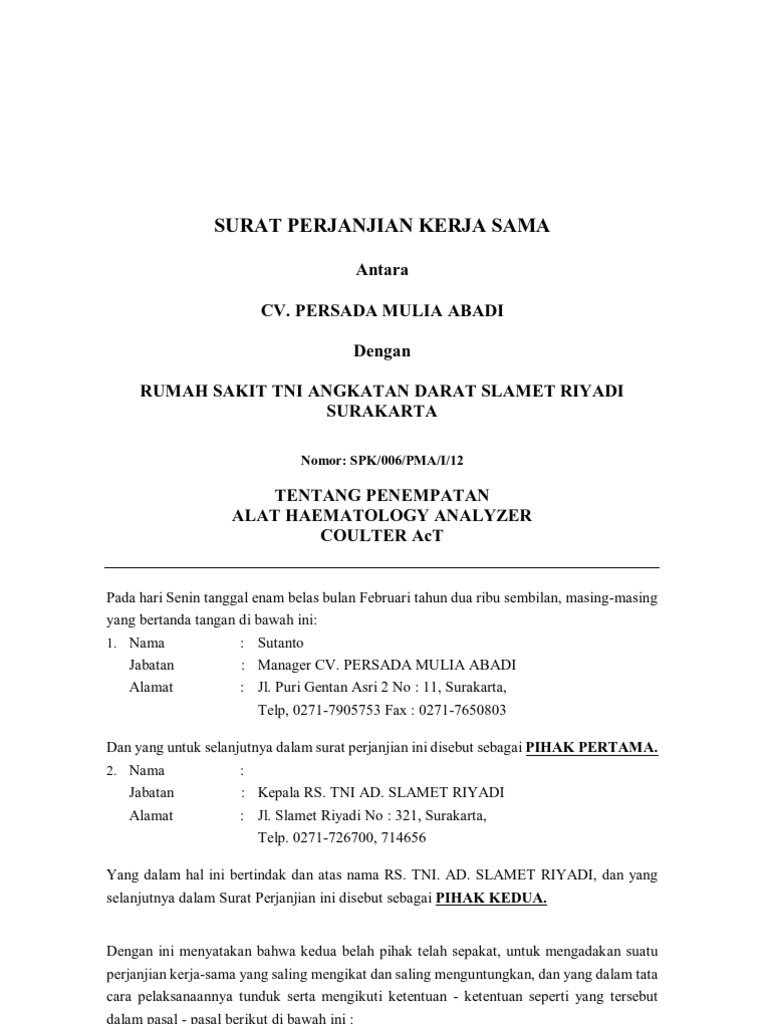 Contoh surat perjanjian dalam dunia bisnis pasti tidak jauh dengan yang namanya surat perjanjian. Adapun agar hubungan bisnis dari kedua belah pihak tersebut tetap berjalan dengan baik dan lancar maka alangkah baiknya apabila. Anda dapat mengubah isi perjanjian dan pasal pasal yang ada sesuai kepentingan anda. 15 contoh surat perjanjian kerjasama berbagai bidang sebagai suatu perusahaan yang ingin cepat berkembang maka tentu sebuah perusahaan tidak bisa berdiri sendiri tanpa ikatan dengan perusahaan lain. Contoh surat perjanjian kerjasama melakukan sebuah hubungan bisnis merupakan kegiatan dilakukan oleh kedua belah pihak bisanya salah satu pihak menjadi seorang investor atau pemodal sedangkan pihak satunya lagi merupakan pihak yg mengelola modal tersebut. Contoh surat perjanjian kerjasama ada sangat banyak jenis kerjasama yang mudah kita temukan sekarang ini.