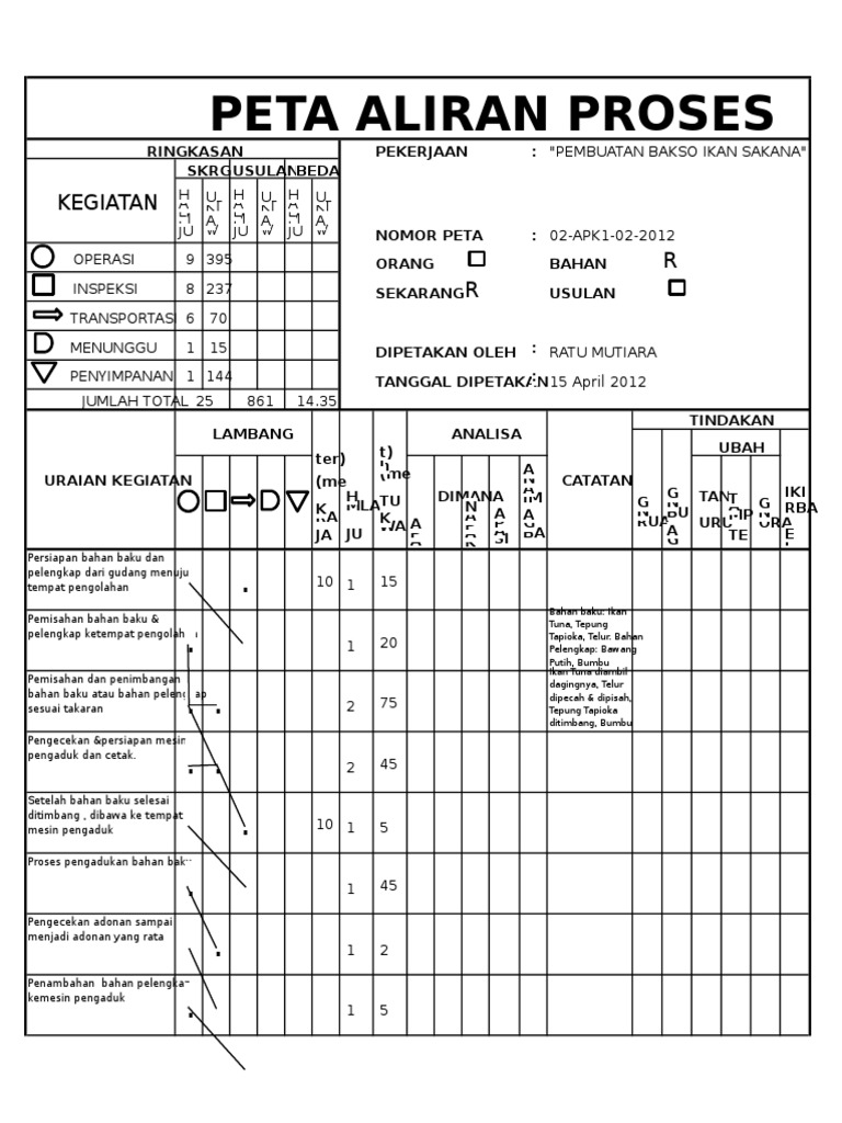 Di dalamnya dimuat informasi informasi yang diperlukan untuk analisis seperti waktu yang dibutuhkan dan jarak perpindahan yang terjadi. Penjelasannya adalah sebagai berikut. Nomornama komponen yang dipetakan nomor gambar peta orang atau peta bahan cara sekarang atau yang diusulkan tanggal pembuatan dan nama pembuat peta. Kemudian diikuti dengan pencatatan beberapa identifikasi seperti. Contoh fm tahun 2010. Seperti pada peta proses operasi suatu peta aliran proses pun mempunyai judul dimana pada bagian paling atas dari kertas ditulis kepalanya peta a liran proses yang kemudian diikuti dengan pencatatan beberapa identifikasi seperti.