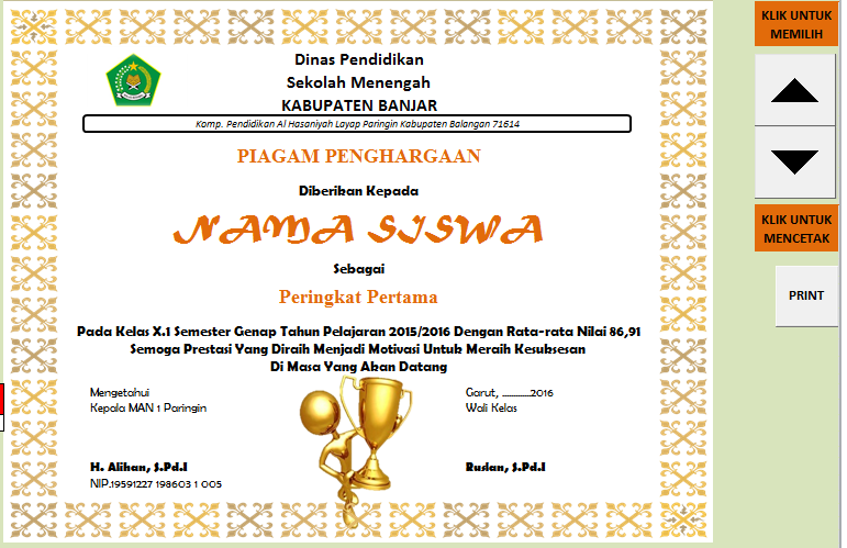 Kali ini adalah aplikasi piagam penghargaan. Memberikan piagam kepada pemenang peserta lomba atau juara kelas merupakan salah satu bentuk ucapan selamat secara simbolik. Mudah mudahan sedikit yang saya bagikan ini bermanfaat. Format ini berbasiskan microsoft word yang diintegrasikan dengan microsoft excel melalui fungsi mail merge.
