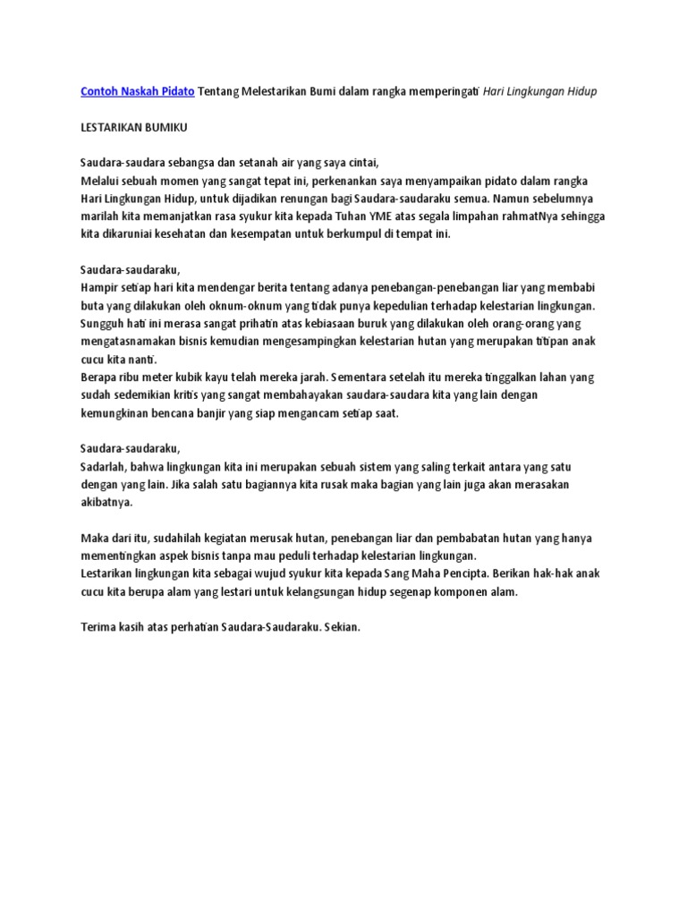 Pidato bisa dilakukan oleh siapa saja namun biasanya dibawakan oleh seseorang yang cukup penting untuk memberikan orasi orasi pada suatu acara tertentu. Silahkan mencermati contoh pidato tentang lingkungan berikut ini. Para hadirin yang saya hormati. Contoh pidato singkat tentang lingkungan pendidikan perpisahan pergaulan bebas kesehatan mudah dihafal by r. Anda bisa menyimak contoh pidato singkat tentang lingkungan hidup berikut ini untuk mempelajari cara membuat teksnaskah pidato sendiri atau juga sebagai bahan latihan membawakan pidato di depan kelas. Posting pada bahasa indonesia ditag cara membuat pidato cara pidato yang baik dan benar contoh pidato karya ilmiah contoh pidato panjang 5 lembar contoh pidato peduli lingkungan contoh pidato peduli lingkungan sekolah contoh pidato perpisahan contoh pidato persuasif contoh pidato persuasif tentang lingkungan contoh pidato singkat tentang kesehatan contoh pidato singkat tentang.
