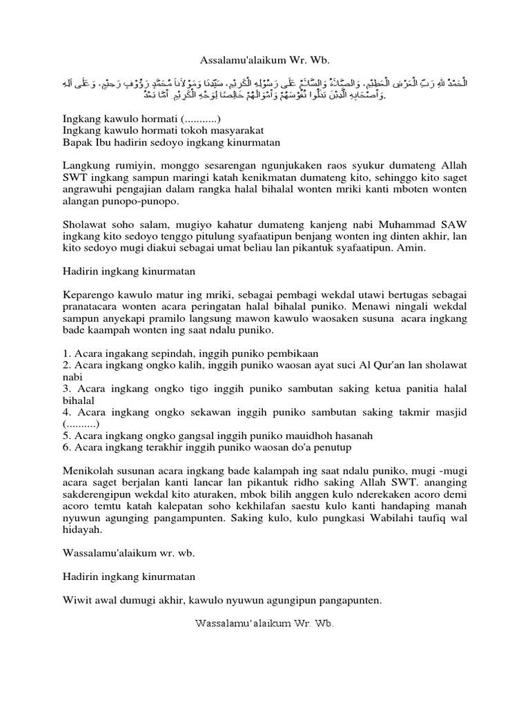 Contoh teks naskah mc bahasa jawa untuk pengajian akbar pada kesempatan kali ini saya akan memberikan 2 contoh teks naskah mc bahasa jawa untuk acara pengajian akbar mungkin bahi kalian yang sedang ada acara pengajian akbar dan anda di tunjuk untuk menjadi pranatacara atau banyak disebut mc dan masih bingung bagaimana cara menjadi mc dalam acara pengajian akbar dalam bahasa jawa. Mugiya kawilujengan lan kasarasan saking ngarsa dalem gusti alloh t. Halo wadhoooh bagus amat pidatonya thanks buat yang udah buatin.