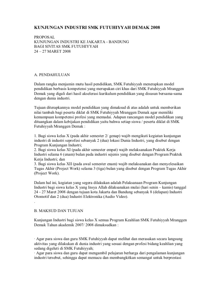 Contoh proposal kunjungan industri. Ilmu pengetahuan dan teknologi berkembang begitu pesat dewasa ini dengan pertumbuhan yang sangat cepat hingga dalam hitungan waktu yang amat singkat. Hal ini karena penting bagi mereka yang sedang menekuni bidang tertentu untuk tahu bagaimana kondisi di lapangan yang sebenarnya. Proposal kegiatan kunjungan industri di malang. Sekolah menengah kejuruan perlu diadakanya kunjungan industri ki. Kunjungan industri dilakukan untuk memberikan gambaran kepada siswa tentang industri dan proses produksi di bidang bisnis dan managemen. Kegiatan kunjungan industri site in home industry kripik buah dan kebun teh malang.