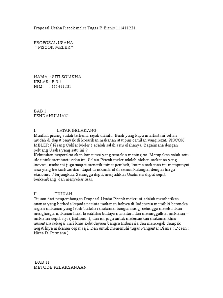 Tujuan dari pengembangan proposal usaha piscok meler ini adalah memberikan nuansa yang berbeda kepada pecinta makanan bahwa di indonesia memiliki beraneka ragam makanan yang lebih baikdari makanan bangsa asing sehingga mereka akan menghargai makanan hasil kreatifitas budaya nusantara dan meninggalkan makanan makanan cepat saji fastfood dan ini juga untuk melestarikan makanan khas. Iman syah taufik 5. Proposal pisang coklat berselimut keju disusun oleh. Proposal usaha membuat makanan khas. Contoh proposal kewirausahaan pisang coklat pisang keju pisang kacang proposal kewirausahaan. Contoh proposal usaha makanan pisang keju coklat informasi guru berikut ini adalah contoh proposal usaha makanan pisang keju coklat yang bisa anda download secara gratis di website kami.