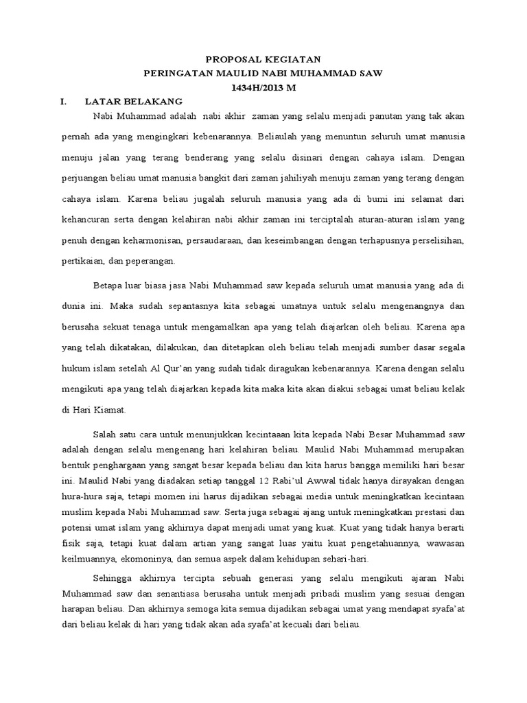 Contoh proposal maulid nabi saw pdf. Tak heran jika dalam setiap perayaan keagamaan terutama islam selalu ada perayaan yang besar dan meriah. Maulid nabi muhammad merupakan bentuk penghargaan yang sangat besar kepada beliau dan kita harus bangga memiliki hari besar ini. Karusel sebelumnya karusel berikutnya. Berikut contoh proposal maulid nabi dibawah ini. Kepada allah lah kami meminta pertolongan dan perlindungan. Contoh proposal kegiatan peringatan maulid nabi muhammad saw kali ini saya bagikan contoh proposal kegiatan peringatan maulid nabi muhammad saw yang dibutuhkan oleh panitia kegiatan untuk mencari dana biasanya dibuat oleh dkm karang taruna majlis talim pondok pesantren atau sekolah juga biasanya membuat proposal ini.