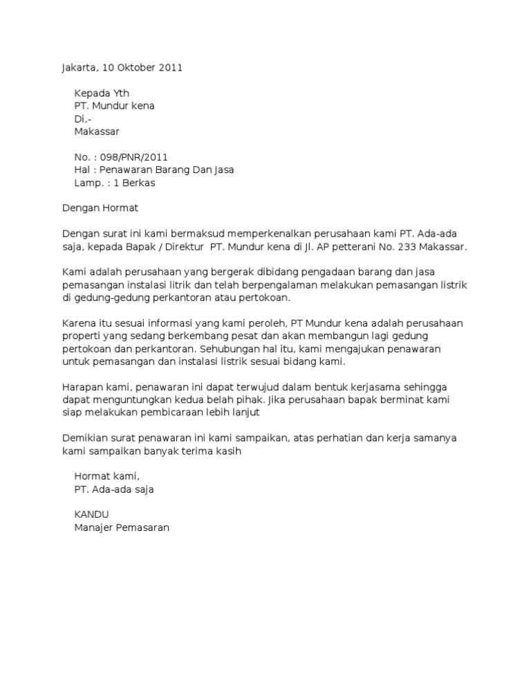 Contoh surat penawaran surat penawaran yaitu surat yang ditulis guna menyampaikan maksud suatu perusahaan untuk menjalin kerjasama dengan perusahaan lainnya. Surat penawaran barang ini biasanya dibuat oleh perusahaan yang ingin menawarkan suatu barang yang berbentuk fisik kepada konsumen baik itu retailer penjual eceran maupun end user pengguna akhir.