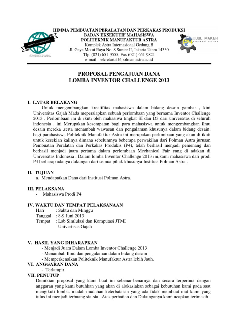 Contoh proposal pengajuan dana ke pt mega food nasional. Contoh proposal permohonan bantuan dana untuk kepentingan umum dan ibadah misalkan saja dalam hal pembanginan sekolah swasta pembangunan masjid musholla pengadaan buku dan masih banyak lagi sebenarnya dalam hal tata penulisanya sama saja namun yang berbeda adalah isi dari propsal permohonan dan tujuan serta beberapa hal yang lain seperti lokasi sumber dana dan tujuan pengiriman proposal. Sertakan semua berkas pendukung proposal dengan data data yang akurat. Ketersediaan dana merupakan faktor penentu suksesnya suatu acara dan besar kecilnya dana yang tersedia akan menentukan konsep dari suatu kegiatan yang akan kita buat. Sertifikat usaha atau pajak. Contoh proposal proposal kegiatan dibuat tentunya dengan tujuan untuk mensukseskan suatu kegiatan baik itu kegiatan organisasi masyarakat organisasi sekolah atau ruang lingkup pendidikan lainnya.
