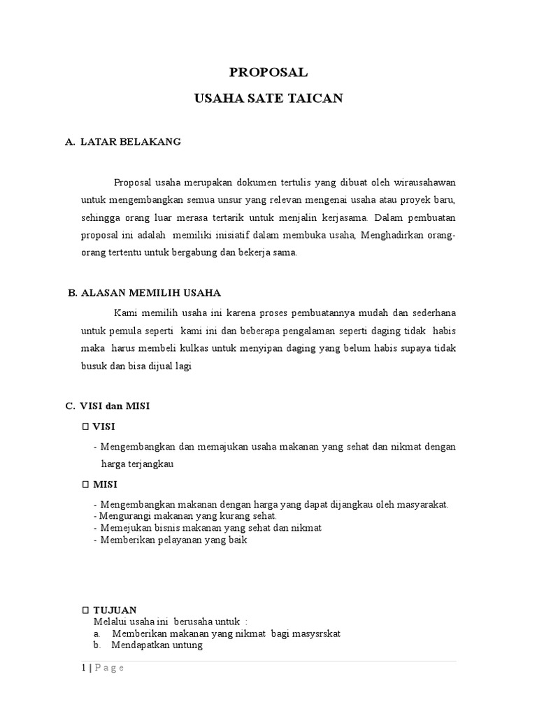 Isi yang jelas dan mudah dipahami. Minimal ialah tempat yang dekat dengan keramaian seperti pasar terminal atau sekitar pangkalan ojek dan tempat yang banyak orang berlalu lalang lainnya. Mampu memenuhi kebutuhan dan selera konsumen. Dengan makanan ini dilakukan dengan cara pembuatan yang sederhana dengan lebih baik dan higienis begitu juga harga terjangkau dan. Berikut ini akan saya jelaskan sitematikanya disertai contoh proposal usaha. Proposal usaha atau bisnis memiliki susunan yang tidak sama dengan proposal kegiatan.
