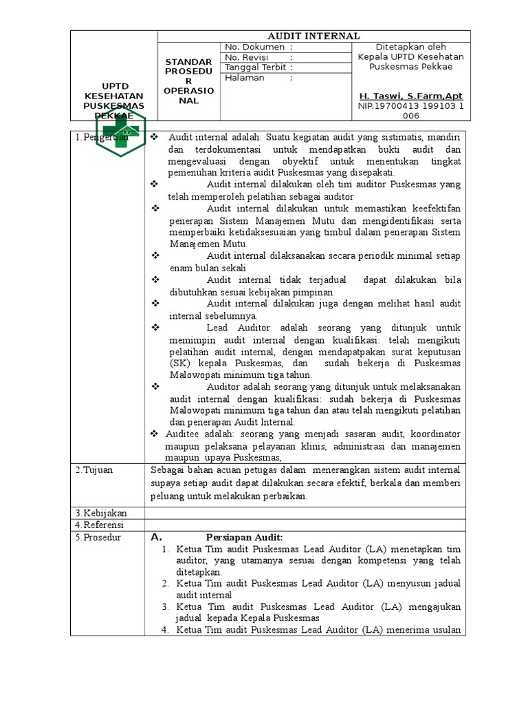 Sop audit internal lihat disini 2. Dalam prosedur internal audit harus jelas juga siapa yang akan menjadi audit or untuk melakukan audit ke se mua bagian termasuk manajemen auditor yang bertugas dalam pelaksanaan internal auidt dapat diambil dari se mua bagian asalkan tela h mendapatkan pelatihan internal audit dari internal maupun ekst er nal.