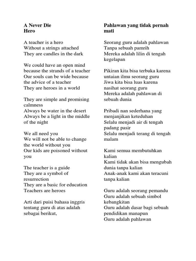 Sedang mencari inspirasi untuk membuat puisi bahasa inggris. Contoh puisi bahasa inggris puisi merupakan salah satu karya sastra yang hingga saat ini masih sering di gunakan untuk menyampaikan pesan dalam bentuk kata kata. 9 contoh puisi bahasa inggris tentang pendidikan beserta artinya pendidikan menjadi salah satu aspek terpenting dalam kehidupan manusia. Makna dari isi puisi itu sendiri sangat beragam mulai dari puisi cinta puisi persahabatan puisi tentang pahlawan puisi tentang keindahan alam dan masih banyak lagi lainnya. Tetap semangat berikut puisi bahasa inggris dari cobi untuk teman latihan. Ketika membaca puisi dalam bahasa inggris teman akan harus memahami makna sebuah kata dengan lebih mendalam.