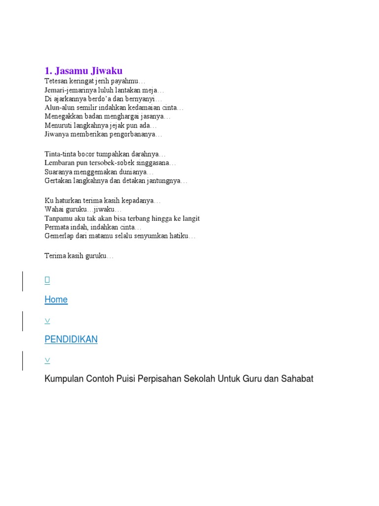 Setiap pertemuan pasti akan berujung perpisahan. Berikut adalah kumpulan puisi perpisahan lengkap. Contoh puisi sekolah di tk sd sltp slta akan memberikan sensasi seolah kembali lagi ke sekolah dan ingin kembali ke sekolah. Ada nggak dari beberapa contoh tersebut yang membuatmu terharu. Berikut ini merupakan contoh puisi perpisahan tentang sekolah guru maupun sahabat. Puisi perpisahan sekolah sekolah adalah tempat kita menimba ilmu bermain belajar dan bertemu dengan orang orang barudi sekolah kita bisa bertemu dengan teman teman dan bahkan kadang berakhir dengan sahabat dan cinta.
