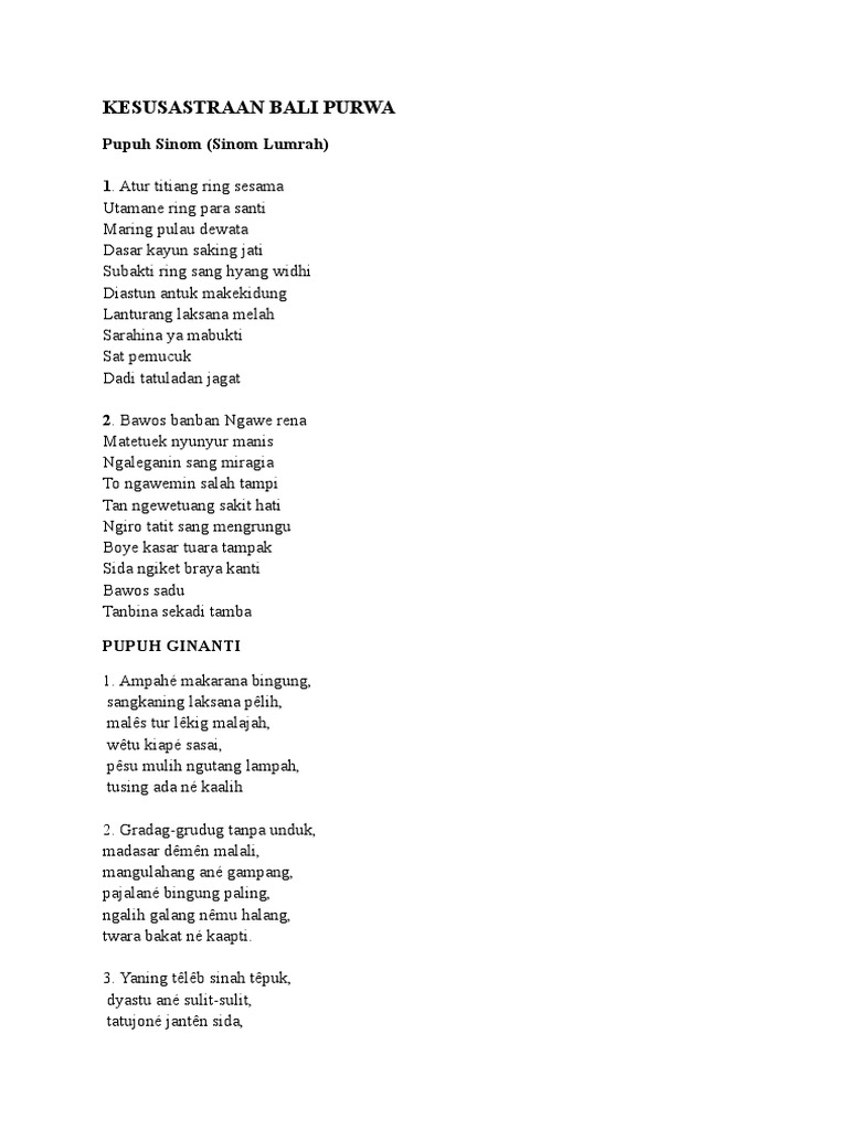 Contoh pupuh sinom bali. Budaya bali wednesday october 31 2012. Karena itu dalam menikmati geguritan dengan membaca itu tidak bisa disamakan dengan membaca karya sastra yang tergolong prosa. Contoh sekar alit pupuh berikut ini saya sajikan tugas seni budaya saya yaitu membuat salah satu seni vokal bali yaitu sekar alit atau pupuh. Anggen ngajegin bali. Ayu january 31 2019 at 303 am. Ninggarang ban munyi bali 8i.