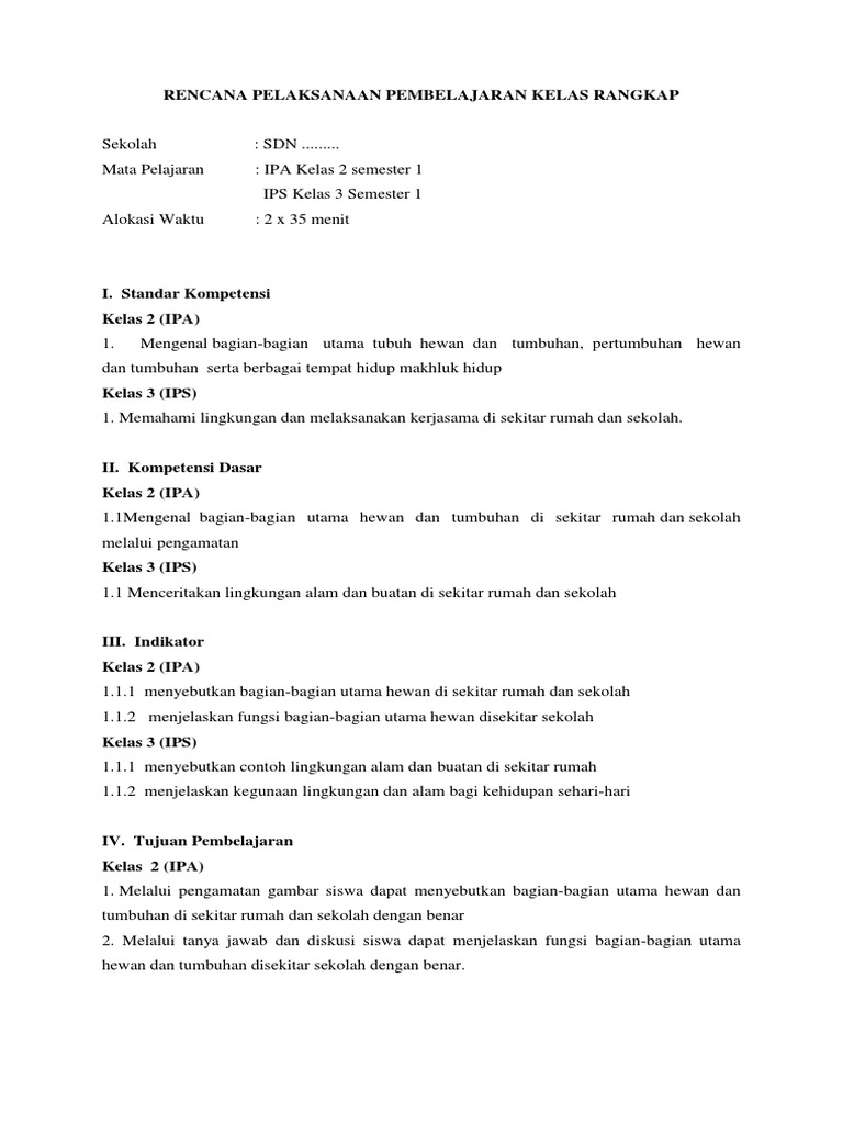 Rpp kelas rangkap mata pelajaran. Kelas 2 ipa 1. 2 x 35 menit. Pada mata kuliah pembelajaran kelas rangkap pdgk 4302 defi selfia anggraini. Contoh rpp kelas rangkap model 221. Sd negeri cermee 3.