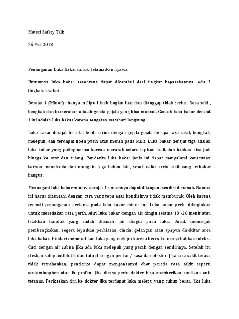 Contoh safety talk singkat. Safety talk untuk pemakaian alat pelindung diri. Bahaya bahaya ditempat kerja berikut ini contoh bagaimana anda akanmenyampaikan materi dalam toolbox meeting sekali lagi ini hanya contoh. Contoh safety talk singkat pesan singkat kepada seluruh karyawan yang dalam sebuah perusahaan sangatlah diperhatikan dalam tiap harinya agar kehati hatian dalam bekerja selalu diperhatikan. Academiaedu is a platform for academics to share research papers. Materi p5m safety minute safety toolbox atau safety talk biasanya digunakan oleh tim keselamatan dan kesehatan kerja untuk memulai sebuah pekerjaan hari atau rapat. Kiranya kita cukup dulu sampai disini materi kita pagi ini.