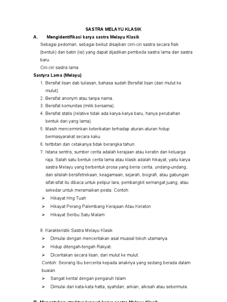 Agar memudahkan anda untuk bisa memahami dari isi artikel ini maka anda bisa melihat contoh dalam pembuatan karya sastra klasik dibawah ini. Disebut sastra melayu klasik karena bahasa yang digunakan merupakan bahasa melayu. Satu contoh dari karya sastra melayu klasik adalah hikayat yang berbentuk prosa. Karya sastra melayu klasik pengertian ciri jenis unsur contoh untuk pembahasan kali ini kami akan mengulas mengenai karya sastra melayu klasik yang dimana dalam hal ini meliputi pengertian ciri jenis unsur dan contoh untuk lebih memahami dan mengerti simak ulasan dibawah ini. Sastra melayu klasik adalah sastra yang berbentuk lisan yang tercipta dari suatu ujaran atau ucapan. Sastra melayu klasik bersifat imitatif atau meniru yang diwariskan secara turun temurun.