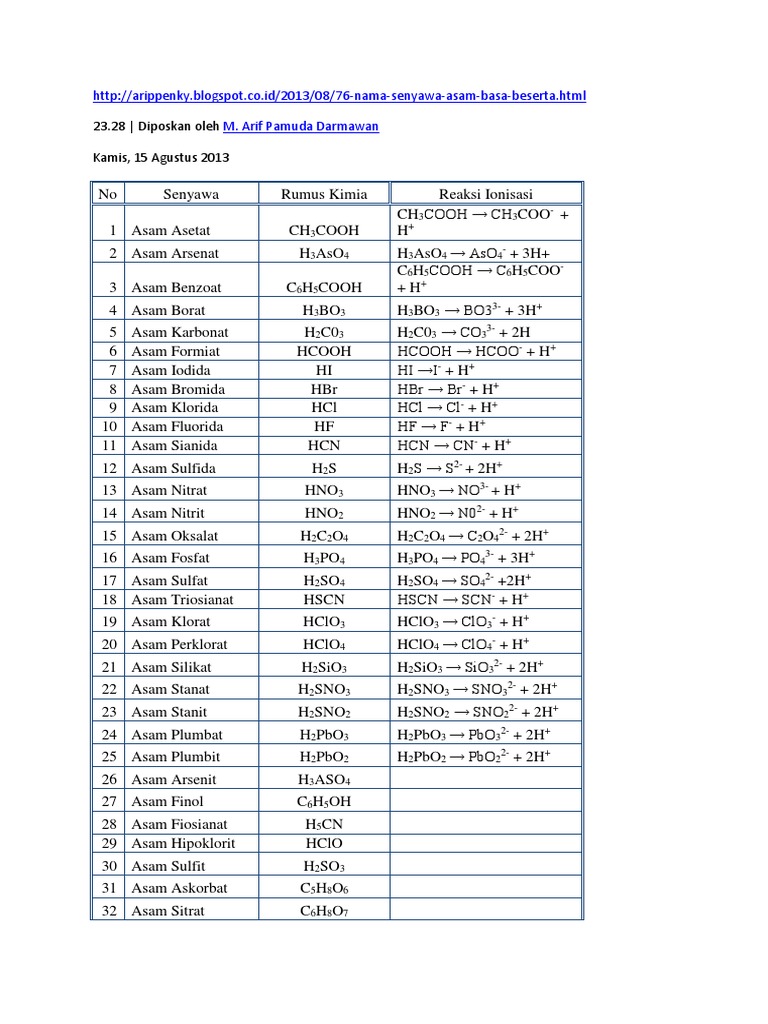 Asam adalah senyawa kimia yang bila dilarutkan dalam air akan menghasilkan larutan dengan ph lebih kecil dari 7basa adalah senyawa kimia yang menyerap ion hidronium ketika dilarutkan dalam air. Basa adalah senyawa yang jika dilarutkan dalam air melepaskan ion oh. Oke langsung saja berikut ini penjelasan tentang asam dan basa. 1asam klorida hcl 2asam slanidahcn 3asam sulfidah2s 4asam sulfath2so4 5asam fosfith3po4 6asam arsenath3aso4 7asam benzoatc6h5cooh 8asam borath3bo3 9asam karbonath2co3. Untuk yang garam postingan selanjutnya aja ya he he. Daftar asam basa kuat dan lemah january 19 2017 erika krissanta 6 comments asam basa calcium chemistry clorit hidro science karena lagi ngerjain tugas sekolah jadi sekalian aja ya nih erika kasih info tentang beberapa contoh asam dan basa sekaligus pembagiannya berdasarkan kuat dan lemahnya.