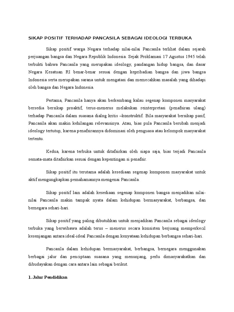 Contoh sikap positif terhadap pancasila sebagai ideologi terbuka. Contoh sikap positif terhadap pancasila sebagai ideologi terbuka muttaqinid pancasila sebagai dasar filsafah negara pandangan hidup bangsa serta ideologi bangsa dan negara bukanlah hanya merupakan rangkaian kata kata yang indah tetapi juga harus diwujudkan dan diaktualisasikan dalam berbagai bidang dalam kehidupan masyarakat berbangsa dan bernegara. Menjunjung tinggi nilai nilai ketuhanan bahwa setiap warga sudah seharusnya mempunyai cara berpikir sikap dan perilaku yang menjunjung tinggi nilai nilai ketuhanan yang maha esa. Contoh sikap positif terhadap pancasila sebagai ideologi terbuka. Sikap dan perilaku positif nilai nilai ketuhanan yang maha esa sehubungan dengan pancasila sebagai ideologi terbuka dapat ditunjukkan antara lain. Contoh sikap positif terhadap pancasila sebagai ideologi terbuka secara umum pengertian pancasila sebagai ideologi terbuka adalah pancasila sebagai ideologi terbuka memberikan kita kebebasan asalkan menyaring mana yang baik dan benar agar tidak melanggar nilai nilai pancasilahal ini dapat dilakukan dengan bersikap sewajarnya atau positif mengenai dasar negara kita pancasila. Sikap dan perilaku menjunjung tinggi nilai nilai keadilan sosial bahwa dengan menjunjung tinggi nilai nilai keadilan sosial bagi seluruh rakuat indonesia yang sesuai dengan sifat pancasila sebagai ideologi terbuka hal ini akan mengarah pada terwujudnya kesejahteraan lahir dan batin yang berkeadilan sosial bagi seluruh rakyat indonesia tanpa kecuali.