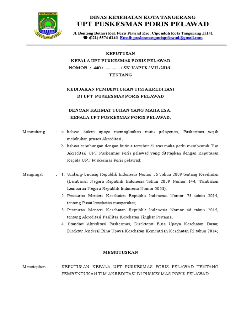 Contoh sk akreditasi puskesmas. Sk tim akreditasi puskesmas. Simpan simpan contoh sk akreditasi puskesmas untuk nanti. 085227217675 jasa penyusunan angka kredit perawat terampil. Semua pemeriksaan penunjang diagnostik tindakan dan pengobatan yang diberikan pada pasien dan kewajban perawat dan petugas kesehatan lain untuk mengingatkan pada dokter jika terjadi pengulangan yang tidak perlu. Surat keputusan kepala pukesmas abcd nomor 009kapusiii2014 tentang kebijakan mutu dan keselamatan pasien puskesmas abcd. Contoh dokumen kebijakan contoh kerangka acuan contoh pedoman contoh sk contoh sop contoh daftar tilik sampul daftar tilik.