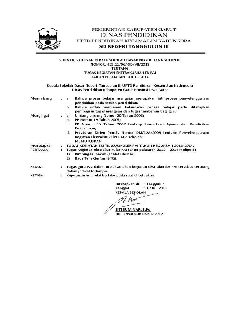 Surat keputusan pengangkatan pembina ekstrakurikuler merupakan sebuah dokumen yang di buat oleh kepala sekolah untuk pengangkatan kepala atau pembina pada kegiatan ekstrakurikuler di sekolahmadrasah. Download materi wawasan wiyata mandala ppt contoh program kerja guru bk bimbingan konseling. Contoh sk kegiatan ekstrakurikuler sekolah sd smp sma smk 2017 ini merupakan file terbaru yang akan saya bagikan untuk kepala sekolah dalam mengangkat pembina ekstrakurikuler disekolahnya melalui sk pembina ekstrakurikuler yang dapat anda download secara gratis dalam postingan kali ini. Contoh sk kegiatan ekstrakurikuler madrasah. Dalam sebuah kegiatan yang akan dilaksanakan di sekolah atau madrasah tentunya membutuhkan surat keputusan agar kegiatan yang bapak dan ibu laksanakan jelas sesuai dengan tupoksinya tugas pokok dan fungsi. Kumpulan contoh surat keputusan sk kepala sekolah lengkap administrasi sekolah sk kepala sekolah surat keputusan atau yang biasa lebih dikenal dengan sk merupakan sebuah surat pernyataan yang dikeluarkan oleh lembaga tertentu formal maupun non formal yang berisi suatu kebijakan atau keputusan tertentu yang berhubungan dengan lembaga tersebut.