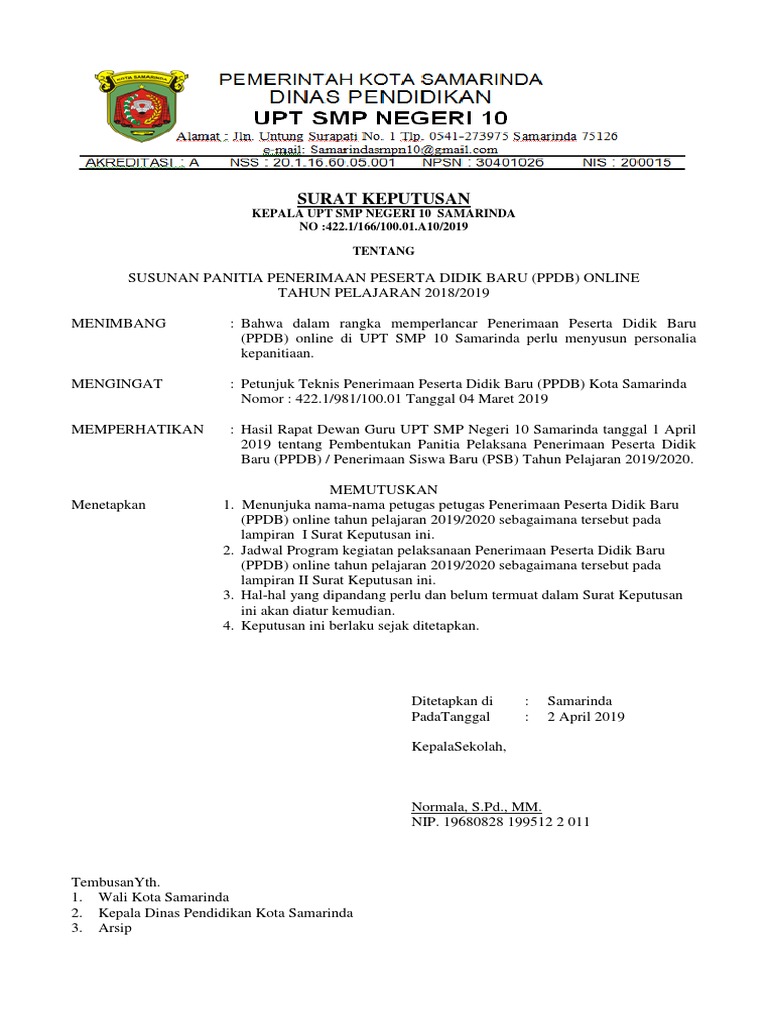Contoh sk panitia ppdb. Sk panitia ppdb di buat oleh kepala sekolahmadrasah sebagi pengesahan dan pemilihan nama nama anggota di lakukan saat rapat koordinasi oleh kasek dan dewan guru. Semoga bermanfaat buat anda semua. Sk ppdb akan sangat penting bagi sekolah sebab selain menjadi arsip bagi sekolah sk ppdb tersebut juga akan sangat di butuhkan oleh mereka yang menjabat sebagai panitia ppdb baik untuk keperluan kenaikan pangkat bagi pns maupun sebagai kelengkapan berkas ketika akan melakukan kegiatan akreditasi sekolah. Bagi sekolah madrasah yang belum memiliki contoh sk penerimaan peserta didik baru ppdb jenjang sdmi smpmts smama tahun pelajaran 20202021 bisa mengunduhnya melalui tautan link di bawah ini. Bagi anda yang berminat unduh file contoh sk ppdb tahun ajaran 20192020 anda dapat unduh pada tautan berikut ini. Sk panitia ppdb penerimaan siswa baru.