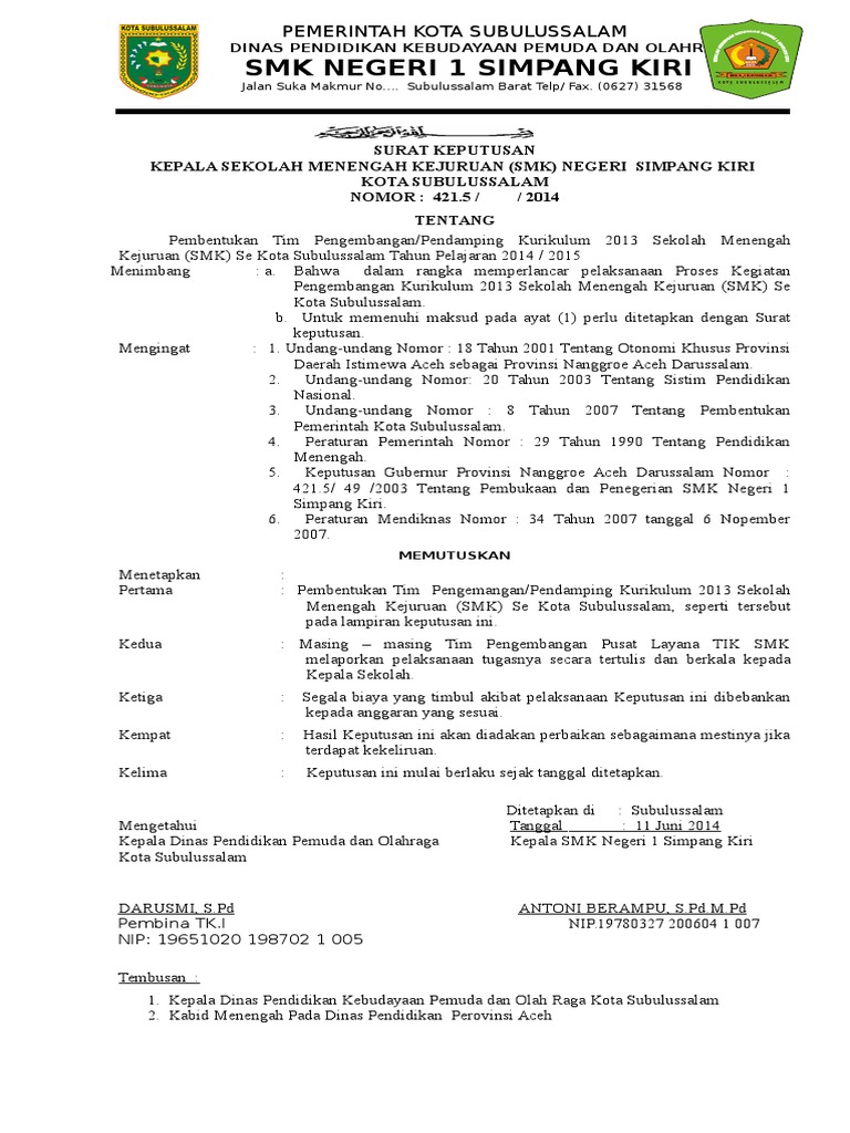 Contoh sk tim pengembang kurikulum. Nah untuk selengkapnya bapak ibu yang belum memiliki contoh sk penetapan kurikulum tahun 2018 bisa mengunduhnya melalui tautan link yang saya sematkan di bawah ini. Sk penetapan kurikulum yang cobat saya bagikan ini dapat digunakan sebagai contoh referensi dalam pembuatan sk penetapan kurikulum sd smp sma smk tahun pelajaran 20182019. Contoh file download rpp silabuskikd prota promes dan kkm kelas 5 sd ktsp berikut ini adalah kumpulan dari berbagi sumber tentang contoh sk tim pengembang kurikulum yang bisa gunakan untuk administrasigoogle driveinfo gururpp ktsprpp sdsilabus dan diunduh secara gratis dengan menekan tombol download biru dibawah ini. Walaupun demikian jenjang sd smp maupun sma bisa menggunakannya. Salam jumpa kembali rekan rekan pejuang pendidikan masih seputar administrasi pendidikan berikut ini adalah contoh format surat keputusan tentang tim pengembang kurikulum tiap sekolah menengah kejuruan pasti dituntut untuk memiliki dok. Contoh sk tim pengembang kurikulum smk terbaru.