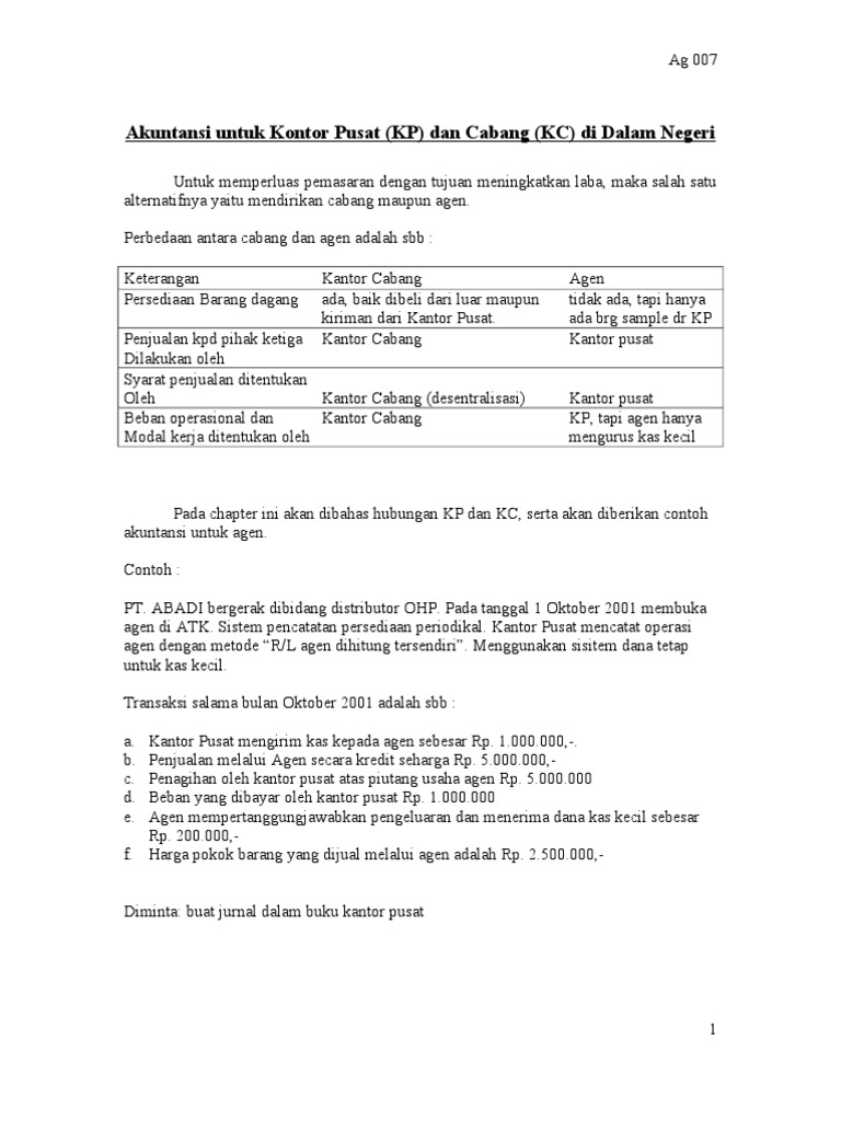 Axia dan cabang medan. Transaksi antara kantor pusat dengan satuan usaha eksternal lainnya dicatat dengan prosedor akuntansi kantor pusat. 842 am akuntansi rekonsiliasi. Pencapaian tujuan pemasaran agen agency atau cabang branch perbedaan. Contoh soal akuntansi kantor pusat dan kantor cabang pt. 1 pada saat pengiriman barang dagangan dari kantor pusat ke kantor cabang terjadi selama periode akuntansi.