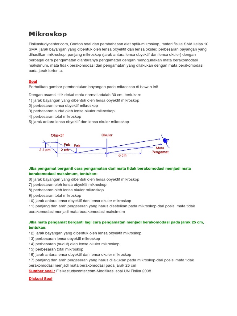 Mata lupkaca pembesar mikroskop teropong bintang teropong bumi 1. Contoh soal pembahasan dan latihan soal alat optik lup kaca pembesar magnifying glass perbesaran lup untuk mata berakomodasi maksimum mata tidak berakomodasi dan mata berakomodasi pada jarak tertentu fisika kelas 10 sma. Dalam komponen alat optik bisa terdiri atas sebuah lensa beberapa lensa ataupun kombinasi antara lensa cermin dan prisma. Teropong dibedakan menjadi beberapa jenis sebagai berikut. Pembesaran pada mikroskop merupakan perkalian kedua lensanya maka. Demikianlah contoh soal dari alat alat optik subbab mata.