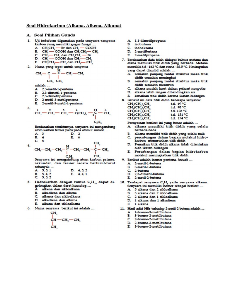 Contoh soal alkana alkena alkuna. Soal kimia alkana alkena alkuna pilihan ganda dan jawabannya no. Alkuna mengalami dua kali adisi oleh h 2 untuk menghasilkan alkana. C 3 h 4 4 o 2 3 co 2 2 h 2 o. Sebetulnya tanpa sadar kita sering berinteraksi dengan senyawa alkana alkena dan alkuna dalam kehidupan sehari hari. Untuk memahami materi ini lebih lanjut berikut ini penjelasan mengenai alkana. Perhatikan 10 soal kimia alkana alkena alkuna pilihan ganda dan jawabannya berikut ini.