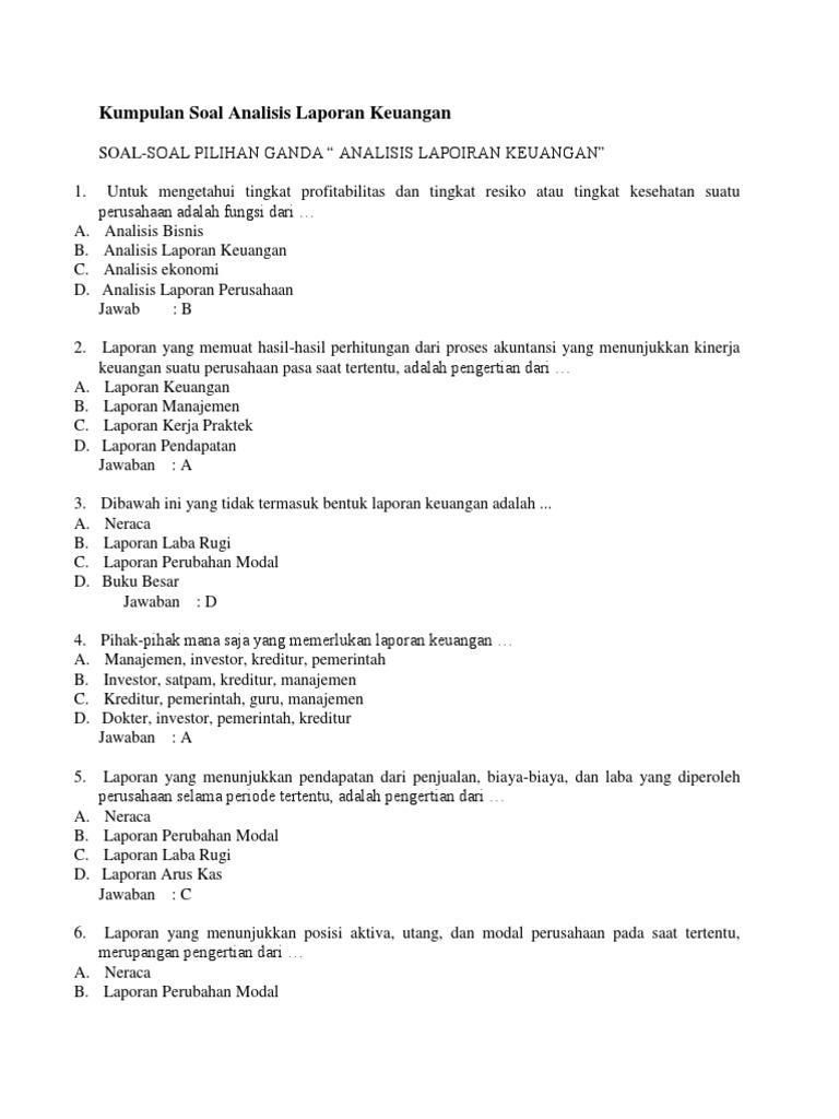Contoh soal analisis laporan keuangan dan jawabannya. Dalam melakukan analisis laporan keuangan salah satu analisis keuangan penting yang tidak boleh anda lupakan adalah analisis rasio keuangan. Laporan keuangan financial statement adalah suatu tahap penyajian posisi keuangan dan kinerja keuangan suatu entitas secara terstruktur. Soal revisi sd smp sma. Seluruh jawaban di atas. Dibawah ini adalah tugas tugas yang dilakukan perantara keuangan atas nama pemakai laporan keuangan kecuali a. Menilai kemampuan perusahaan untuk mengembalikan.