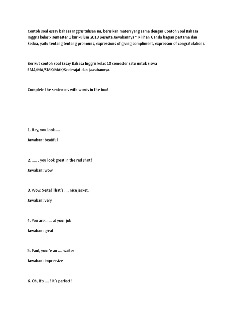 Pengertian review text dalam bahasa inggris materi tujuan dan contohnya. Buku toefl self preparation course exercise 1. I will visit your hometown. Contoh soal song bahasa inggris dan jawabannya kelas xi semester 2 k13 hai selamat datang di website infastpedia adik adik yang baik hati. Contoh soal pilihan ganda bahasa inggris dan jawabannya kelas x semester 2 berikut ini berisikan materi tentang the expressions of thanking complimenting and congratulating selain itu ada juga bentuk soal dengan present perfect tense dan preposition of time. Hari ini bahasainggrisokecom akan mengajak kalian untuk membahas soal yang ada dalam artikel ini dan nantinya bisa kalian jadikan referensi dalam menjawab soal yang di sekolah.
